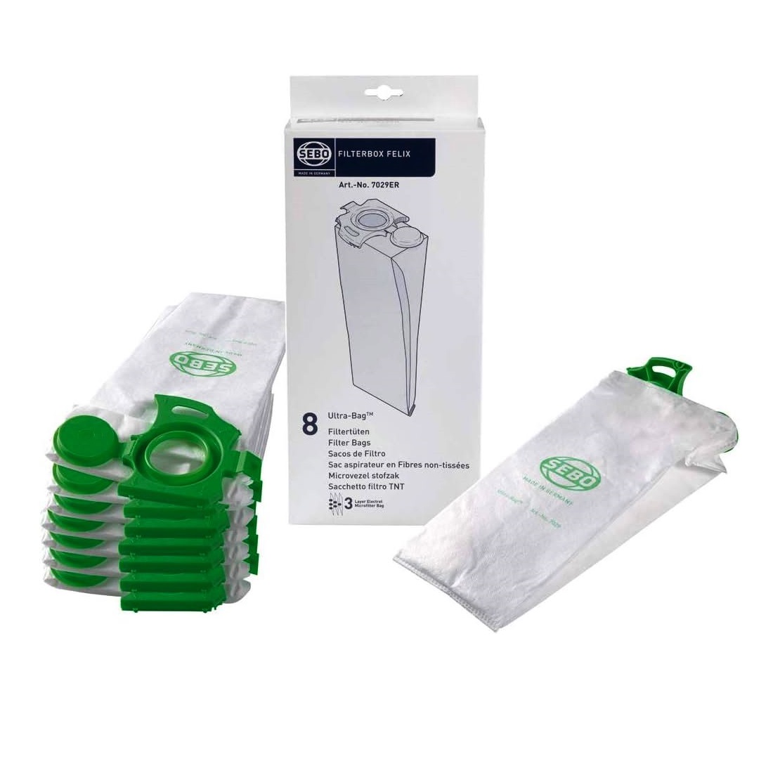 1 Packung mit 8 Staubbeuteln incl. Verschluss für die SEBO Staubsauger Felix 1 , Felix 2 , Felix 3 und Felix 4 incl. der Premium Ausführungen.