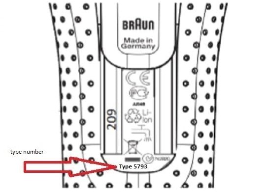 Die Typennummer ist oft sehr klein und erfordert möglicherweise eine gute Beleuchtung oder Vergrößerung, um klar lesbar zu sein. Für diese Clean & Charge Base muss Ihr Rasierer Typ 5793, 5794 oder 5795 sein.